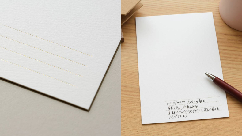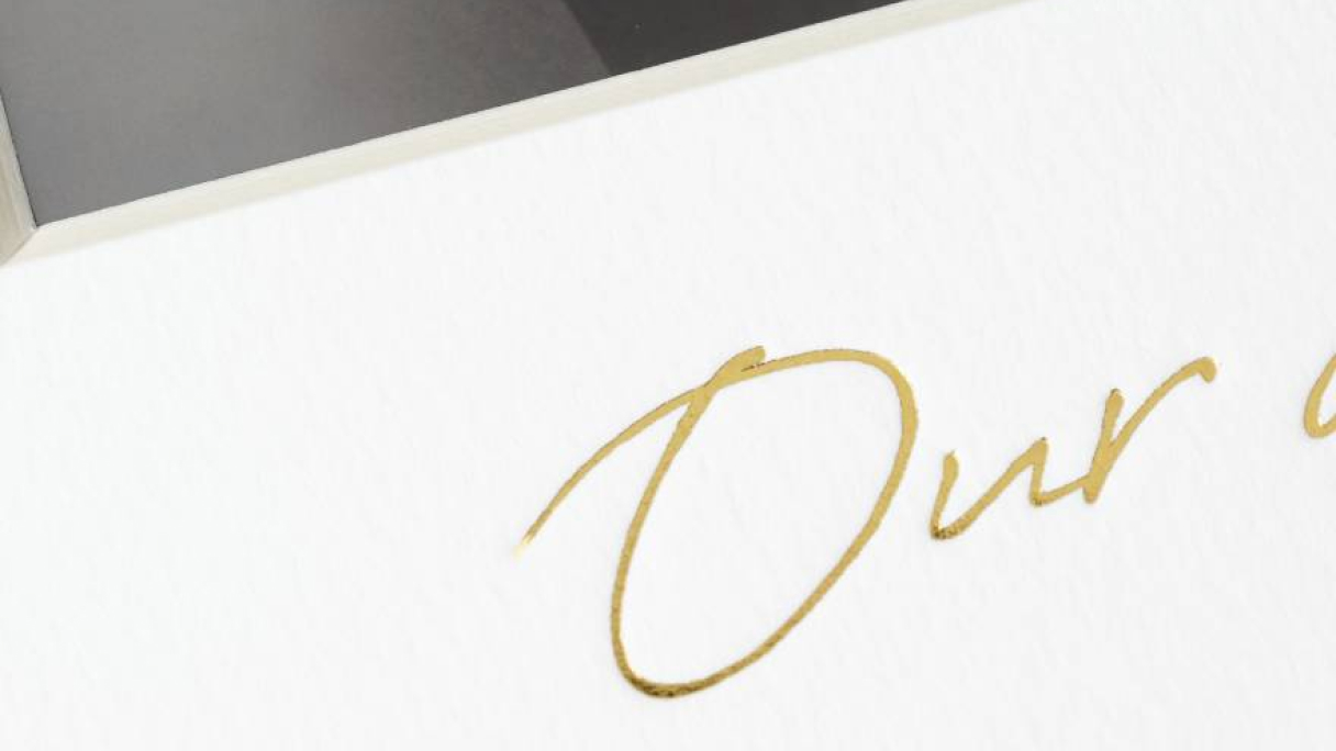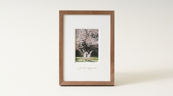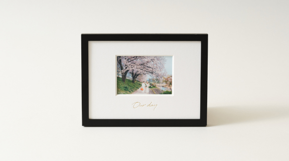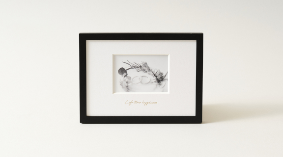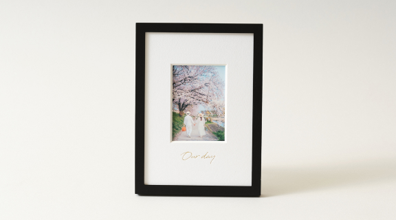 マットの余白には特別感を演出するタイトルをデザイン。ゴールド箔のモダンな手書き風文字であしらった「Life time happiness」、「Our day」からお選びください。シンプルな「タイトルなし」もご選択いただけます。