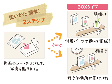 「壁掛け」と「棚置き」、どちらにも対応するBOXタイプ。貼り直しができて、繰り返し楽しめます。