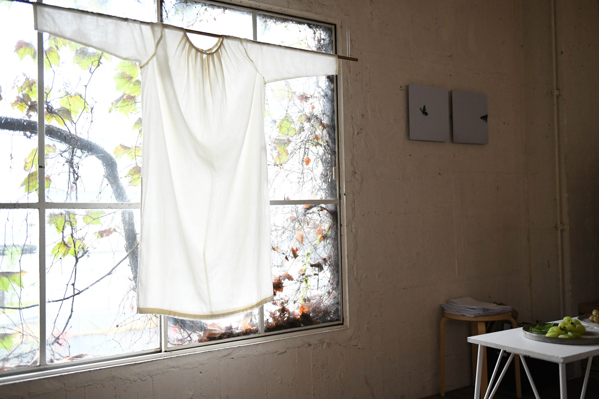 はい。今回のコレクションは「はためく」「蝶のような舞い」といったコンセプトで展開しています。蝶の写真が欲しくて、当初は写真家さんに依頼しようと思っていましたが、日中に私たちのギャラリー(evam eva yamanashi 形)に蝶が庭から迷いこんできて、スモークを貼った大きなガラス面に留まっていまして。シャッターチャンスとばかりに撮影しました。それがこの蝶の写真です。